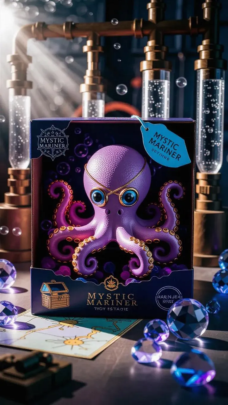 A mystical octopus toy with gold-plated tentacles, a treasure chest cannon, and a crystal ball eye-patch. The box includes a magical map insert, crystal tokens, and a foil "Mystic Mariner" tag. Set against a factory background featuring a fantasy-themed toy line with bubbly tubes and water pumps. Ethereal, soft light illuminates the scene, casting delicate shadows and highlighting the metallic sheen of the gold-plated tentacles. Realistic style with a touch of whimsy.