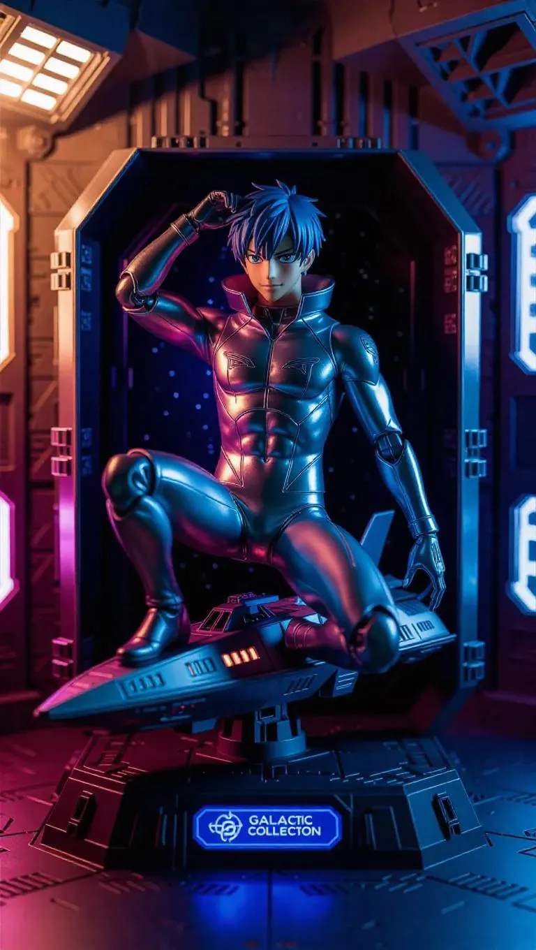 A highly detailed anime-style collectible figure of a dashing space captain with metallic gray skin, short spiky blue hair, and glowing white eyes. He wears a revealing silver latex suit with futuristic patterns, posed heroically on a spaceship base. The figure is packaged in a high-tech toy box with metallic inner lining, chrome embossing, and a holographic "Galactic Collection" label. Set against a sci-fi themed toy space station with flickering console lights and starry shadows. Soft, colorful light casts gentle highlights on his form, enhancing his daring. Style: anime, with a touch of sci-fi and retro-futurism elements.
