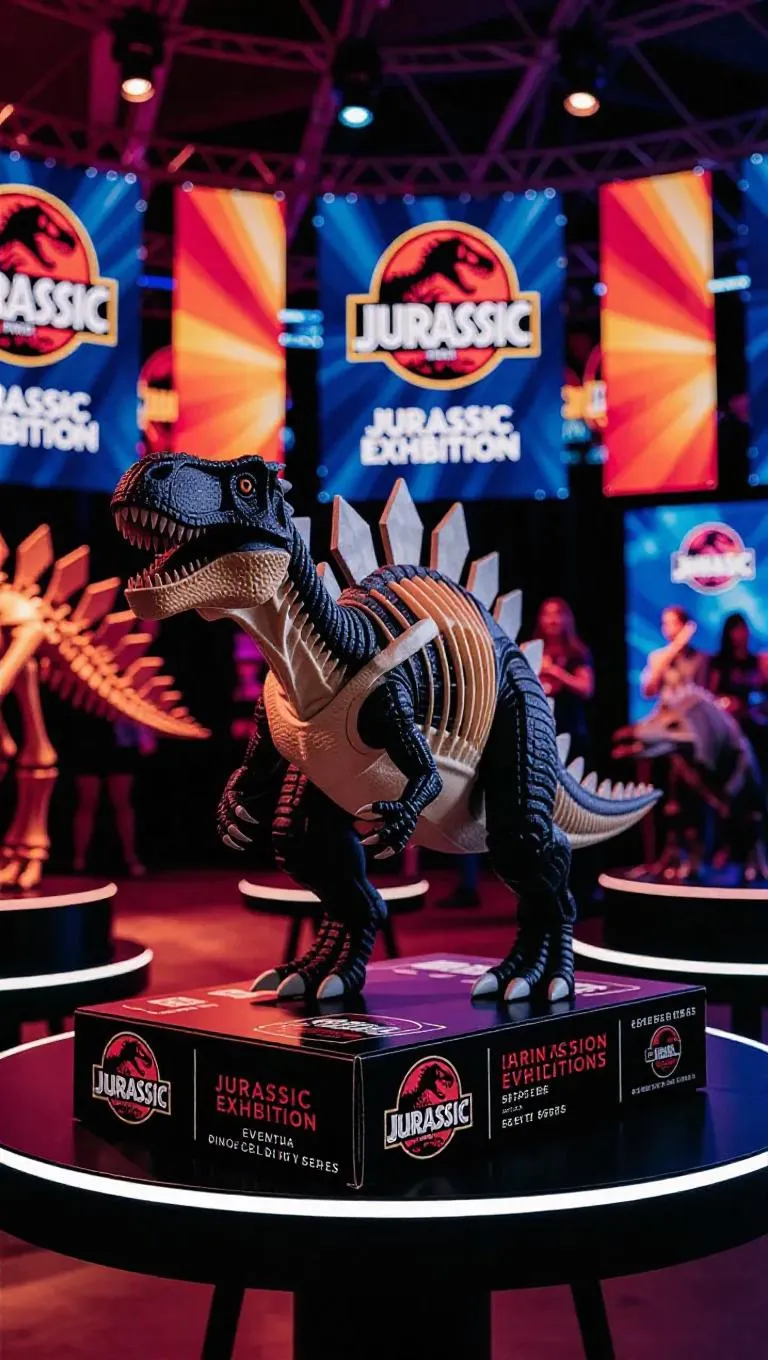 A robotic Stegosaurus toy with foot thrusters and a spiked battering spine stands proudly in a dino-themed event space. The packaging displays bold dinosaur skeleton overlays, event alerts, and "Jurassic Exhibition Series" branding. Bright banners and interactive displays fill the background, enhanced by vibrant, celebratory lighting. The scene conveys a thrilling mix of prehistoric majesty and modern festivities, with a lively design focus on the figure and the event excitement.