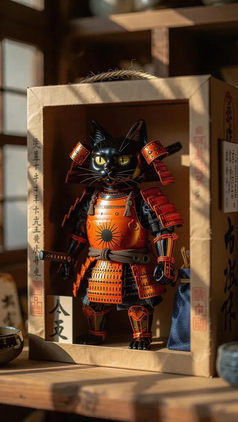 A samurai cat warrior toy clad in lacquered orange armor adorned with sun patterns and double blade tails. The box features rice paper artwork, Japanese ink stamps, and a denim pouch. Set against a rustic workshop with reclaimed wood shelves, the scene is illuminated by warm afternoon light, casting elongated shadows that enhance the toy's detailed craftsmanship. Style: Realistic.