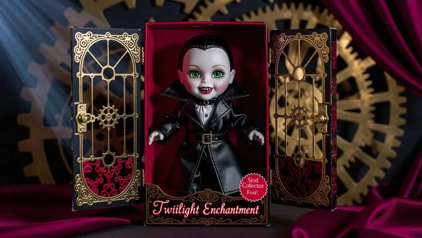 A steampunk vampire doll, a vintage collector toy, features a leather coat, fanged grin, and sparkling emerald eyes. The doll is displayed in a box with intricate brass-trimmed windows, crimson patterns, and a “Twilight Enchantment” foil seal. Set against a background of a shadowy yet enchanting clockwork factory, complete with glowing gears and dark silk drapes. Soft, cool light casts delicate shadows, enhancing the doll’s mysterious allure. Style: Steampunk fantasy.