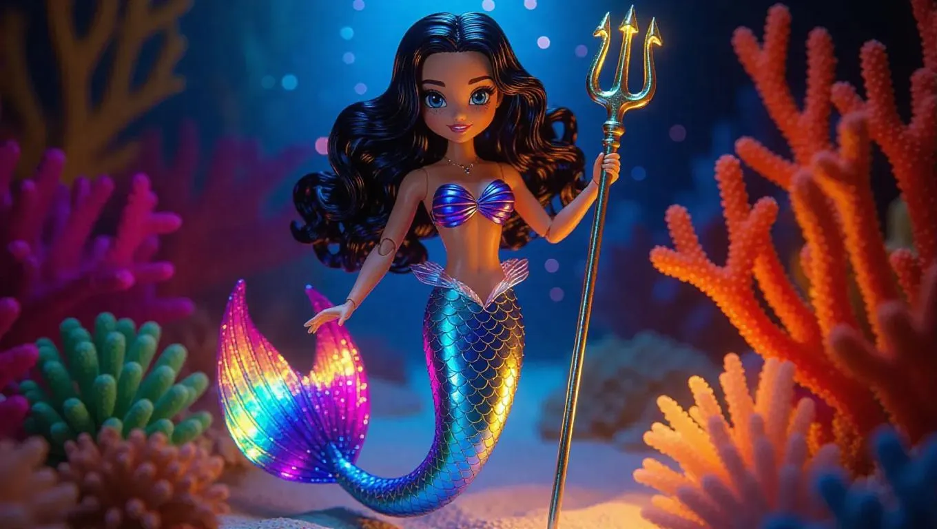 A colony-themed mermaid action figure with multi-colored fins and star freckles, gripping a radiant trident. The packaging features whimsical constellation prints, bright holo foil, and sea-life accessories. The background showcases a toy factory designed like a giant coral reef, illuminated by the soft, twinkling starlight. Natural, soft front light enhances the mermaid's gorgeous scales and the shimmering packaging, creating a magical and serene atmosphere. Style: Enchanted realism.