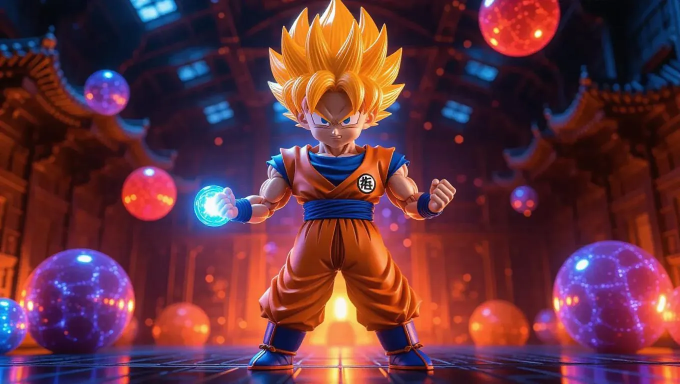 A high-gloss orange and blue robotic Goku mech figure with energy aura hair and a Kamehameha-launching arm stands poised. The figure's packaging is adorned with dragon ball-themed designs and energy orb-shaped holographic labels, including bonus gear arms. The background showcases a magical toy factory filled with floating mechanical dragon balls and a dreamy, whimsical atmosphere. Soft, warm light casts gentle highlights on the figure, enhancing its glossy finish. Style: Adorable and futuristic with a touch of cyberpunk flair.