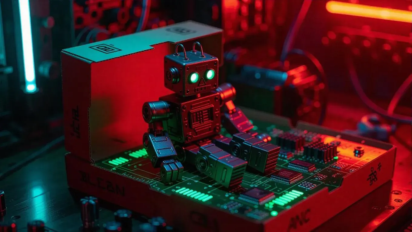 A well-worn toy robot with copper accents rests on a circuit board platform inside his futuristic packaging. The box features a removeable circuitry sticker. In a neon-lit cyberpunk toy factory, green-blue lights reflect off metallic surfaces, enhancing the high-tech, surreal atmosphere. Realistic cyberpunk aesthetics.