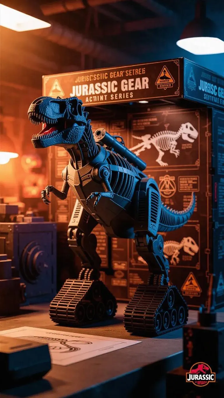A mechanized T-Rex action figure with tank treads for feet and a missile-laden spine stands proudly in a dino-themed factory. The figure's box features metallic dinosaur skeleton overlays, warning labels, and "Jurassic Gear Series" branding. Fossilized blueprints and industrial machinery fill the background, bathed in warm, ambient factory lighting. The scene exudes a blend of futuristic and prehistoric elements, with a realistic style that emphasizes the intricate details of the mech and the factory setting.