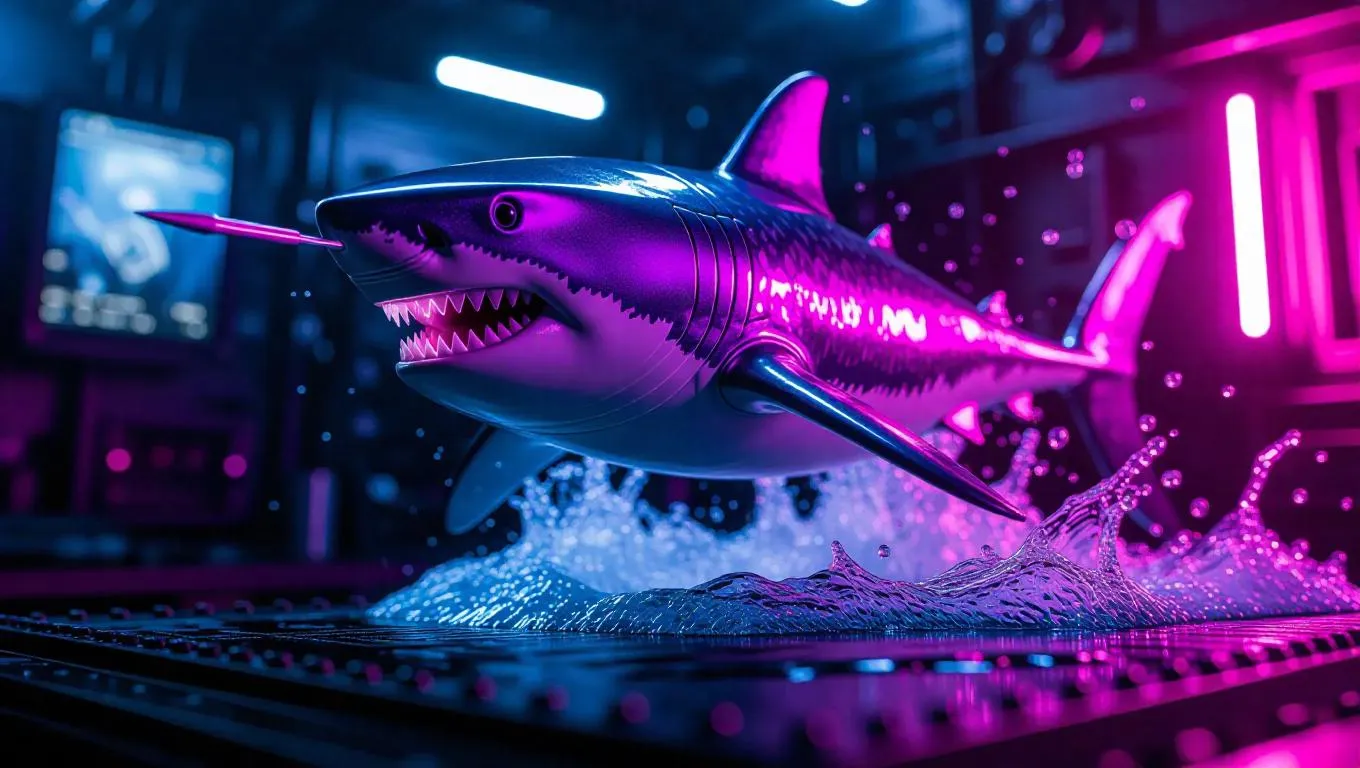 A 1:6 scale superhero shark figure in a dynamic underwater pose, wearing a shiny silver nano-suit with glowing gills and a plasma harpoon. Premium box inserts feature water splash effects and comic-style bubbles. Set against a high-energy toy prototyping chamber, illuminated with bright white and purple lights, hyper-realistic with a touch of comic book flair.