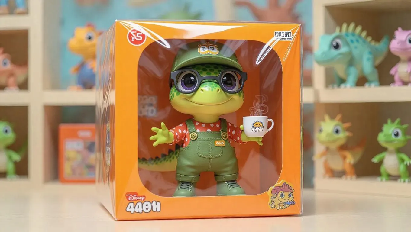 C4D, an orange paper toy box is completely wrapped in transparent plastic film. The box body has a large observation window to show the inside. A 3D cartoon-style dinosaur doll is wearing olive green overalls with a red and white dotted shirt, spiky gold hair, a square face with big purple eyes and bushy eyebrows, a green cap and large spectacles, holding a tea cup, and wearing rugged boots. The package contains two changeable caps and three pairs of hiking shoes of different styles. The background features a rugged toy store display stand in earthy tones. The plastic packaging film reflects the ambient light, presenting a rough texture. The overall picture is full of the energy of a collectible figurine.