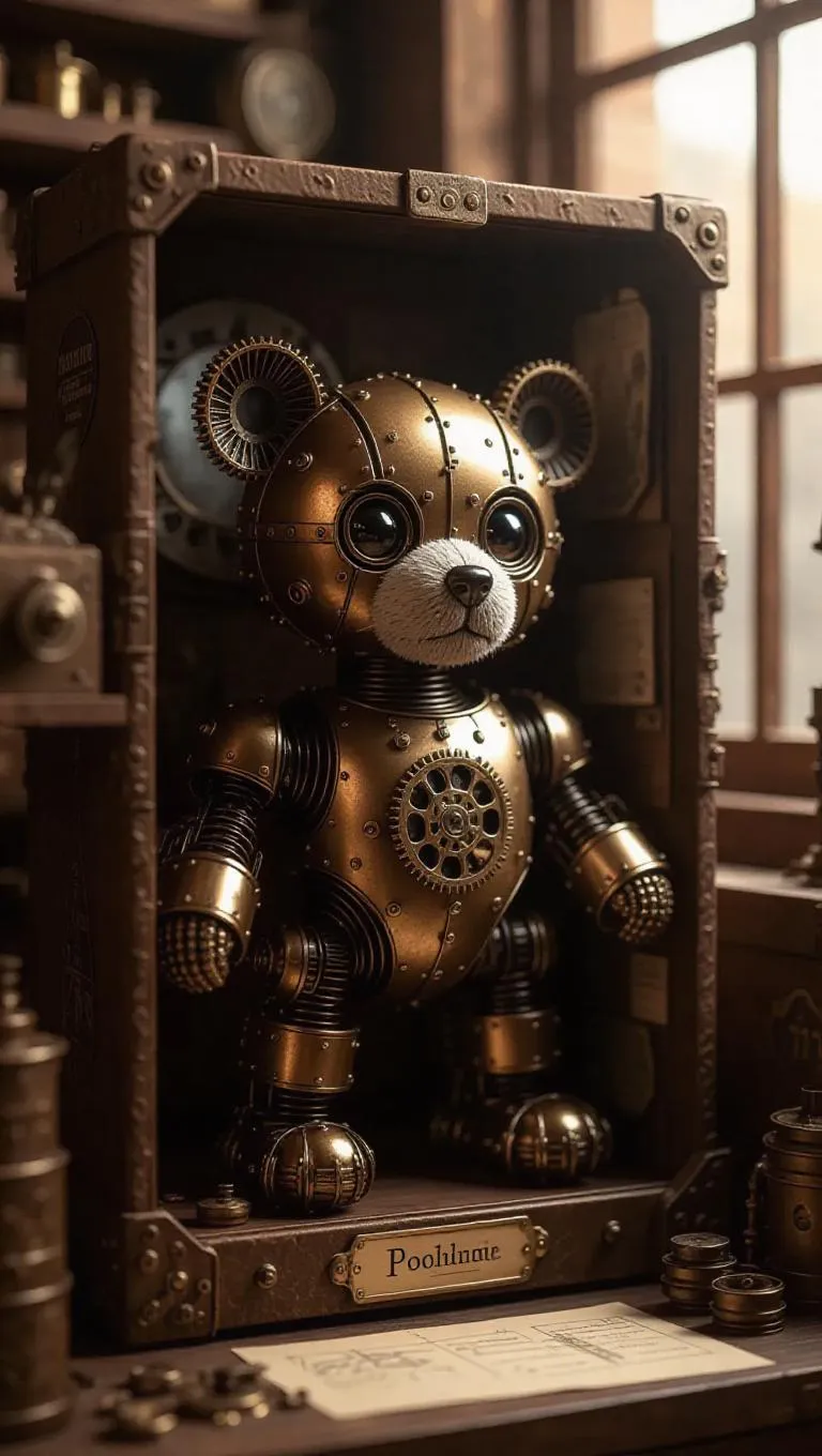 A steampunk teddy bear toy created from aluminum pieces, woven threads, and metal plate eyes, featuring a winding key on its back. It stands in a display box with worn textures, a faux-leather label, and a glass window frame. The scene is set inside a vintage toy workshop, surrounded by sketches and gadgets. Soft, rosy light filters through the windows, casting warm shadows and highlighting the intricate details of the bear and the workshop. The style is realistic, emphasizing the tactile and mechanical elements.