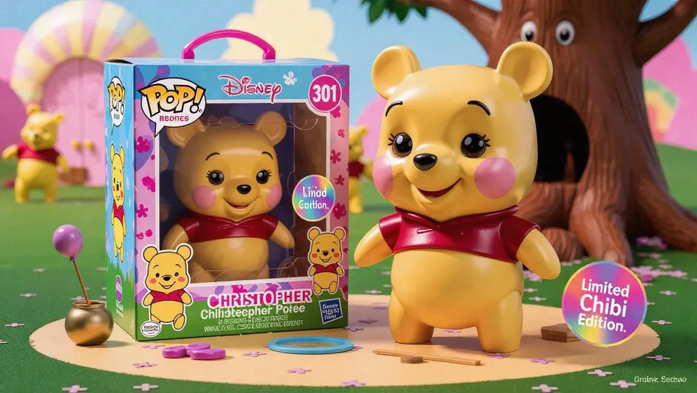 A chibi-style collectible action figure of Christopher Robin, packaged inside a vibrant, colorful toy box. Winnie the Pooh has a super-deformed design with an oversized head, tiny body, and a glossy finish. His iconic round shape is exaggerated for maximum cuteness, with large, sparkling eyes. The packaging features playful, cartoonish fonts, chibi illustrations of Winnie the Pooh in adorable poses, and a holographic 'Limited Chibi Edition' sticker. The box includes accessory parts like a mini honey pot and a tiny balloon. Background showcases a cheerful, pastel-themed Hundred Acre Wood. Style: chibi, kawaii, high detail, collectible figure with soft lighting and vibrant colors.