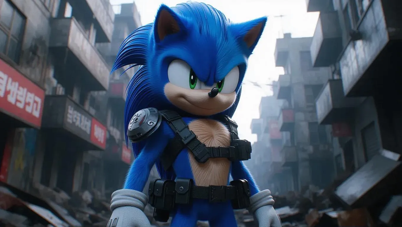 Sonic the Hedgehog, envisioned as a post-apocalyptic survivor, wears tactical shoulder gear, a makeshift tail-blade, and rugged clothing. Dynamic anime-style motion lines and graffiti adorn the box art. The scene is set in a ruined city with crumbling buildings and debris. Gritty, muted light highlights the survival gear and creates a stark contrast with the grey, desolate ambient lighting. The style fuses realistic and anime aesthetics, presenting the mixture of survival and animation.