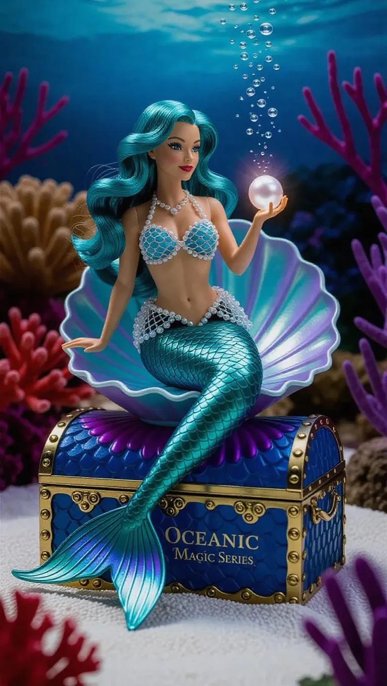 A highly detailed figure of a mermaid enchantress, her long, flowing turquoise hair cascading over her shapely form. Seated on a large, iridescent seashell, her fishtail curls gracefully around her. Pearl-encrusted netting adorns her top, and her tail shimmers with scales in shades of blue and green. Holding a glowing pearl, emitting a soft, otherworldly light. The toy box resembles an underwater treasure chest, textured like coral and seashells, with "Oceanic Magic Series" emblazoned on the front. Vibrant coral reef background, teeming with colorful fish and bioluminescent creatures. Gentle, filtered sunlight creates a dreamy, ethereal glow, enhancing the magical and sensual elements. Fantasy and naturalistic details blend seamlessly.