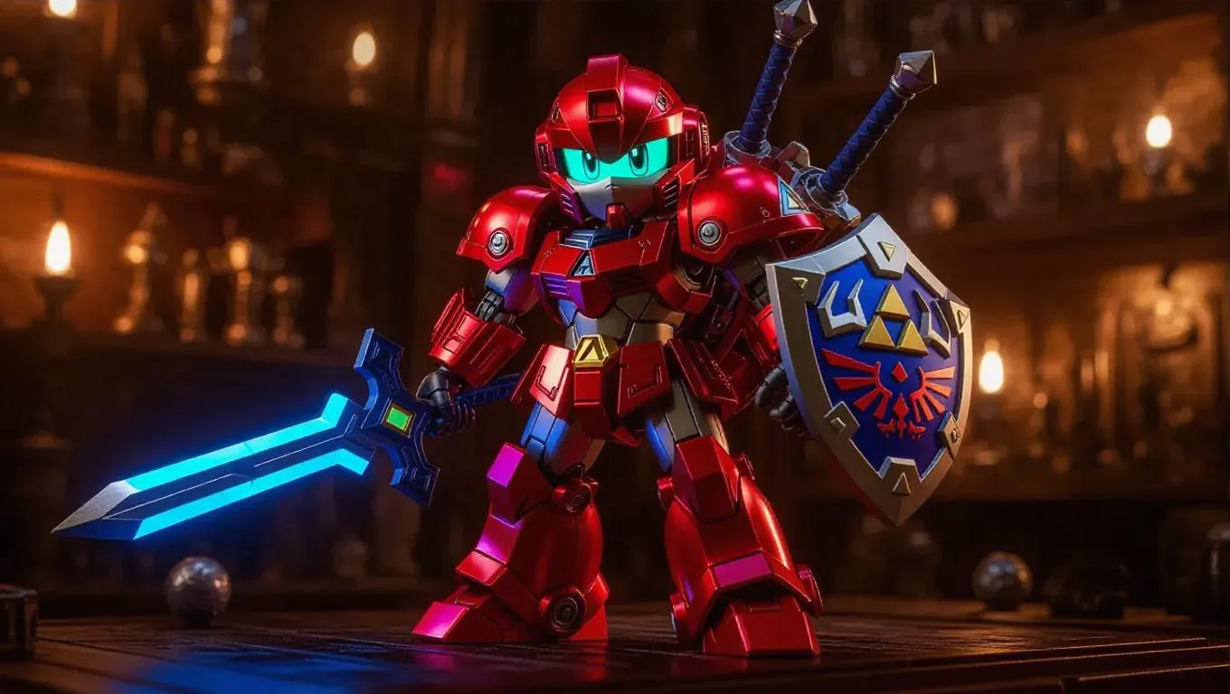 A high-gloss red and silver robotic Link mech figure with Master Sword, shield, and Triforce-launching bow stands prominently. The packaging features Triforce-themed designs and shield-shaped holographic labels, including bonus gear arms. The background is a vintage toy workshop with floating mechanical arrows, mystical lights, and an adventurous atmosphere. Soft, warm light enhances the figure's glossy finish, blending cute and futuristic aesthetics with cyberpunk flair.