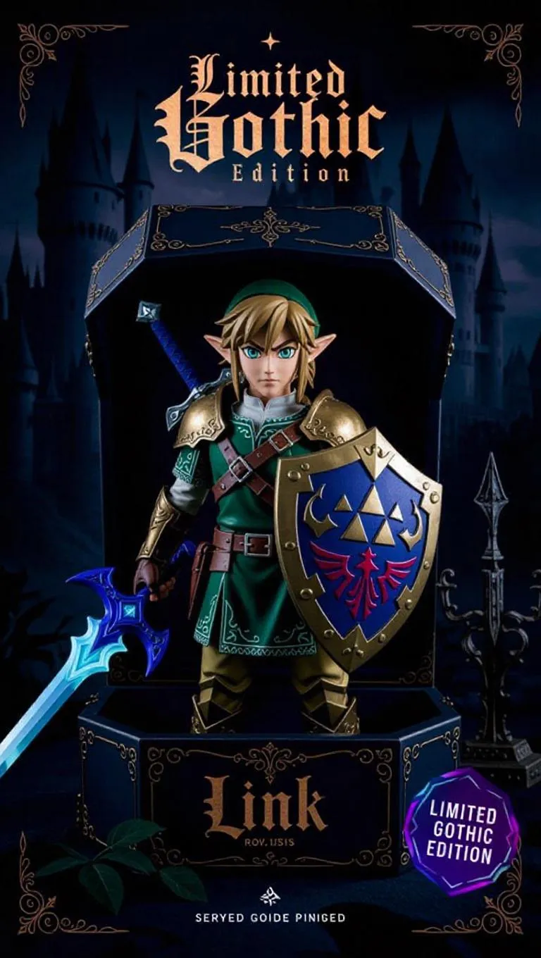 A gothic-inspired collectible action figure of Link, encased in a dark, ornate toy box. Link's gothic redesign features tarnished bronze armor, glowing teal eyes, and leather accents. His Master Sword is adorned with dark runes and azure energy cores, while his shield is enhanced with floral gothic designs. The packaging showcases elegant, gothic-style fonts, dark illustrations of Link in contemplative poses, and a holographic 'Limited Gothic Edition' sticker. Included accessories: Triforce launcher, elven dagger. Background: shadowy Hyrule Castle, peaceful glade, starlit sky. Style: gothic, high detail, dramatic lighting, mystical atmosphere.