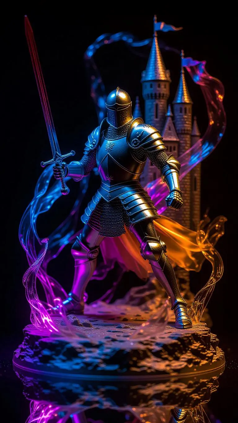 Hyper-detailed toy action figure of a legendary knight, fusing an enchanted lance with radiant light. Translucent energy waves swirl around the figure, crafted from iridescent resin that shifts colors under varying light. The base showcases a floating, haunted castle, capturing the knight in a dynamic mid-charge pose.
