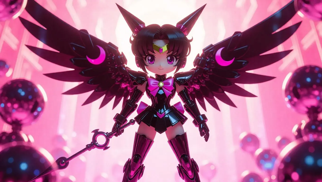 A high-gloss black and pink robotic Sailor Chibi Moon mech figure with crescent moon wings and a dream-launching wand stands prominently. The packaging is adorned with dream-themed designs and crescent moon-shaped holographic labels, featuring bonus gear arms. The background showcases a magical toy factory filled with floating mechanical dreams and a whimsical, celestial atmosphere. Soft, warm light casts gentle highlights, enhancing the figure’s glossy finish. Style: Cute and futuristic with a touch of cyberpunk flair.