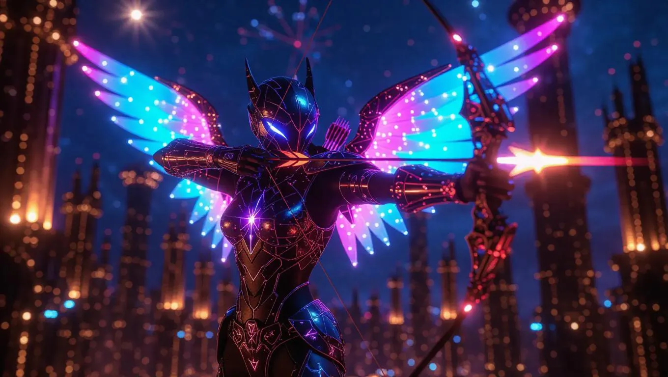 A celestial archer action figure with radiant star-shaped wings and a bow emitting cosmic energy, clad in an outfit adorned with celestial maps. Toy box features a colorful sky full of constellations. Background: A futuristic city with hovering vehicles and shimmering lights. Style: Hyper-realistic with a sci-fi fantasy twist.
