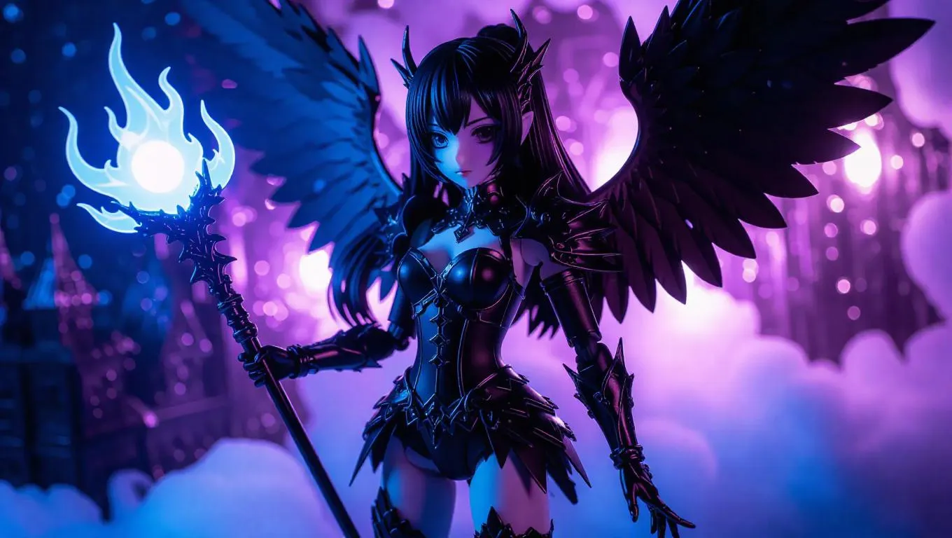 A magical girl action figure with ethereal black wings, a twilight staff, and mystical eyes stands in a daring pose. Her toy box is embellished with ethereal clouds and features her in a heroic magical stance, complete with additional powerful blast accessories. The background is a celestial toy workshop, illuminated by soft, starlit light that deepens the colors and adds a mysterious glow. Style: Realistic with a gothic twist.