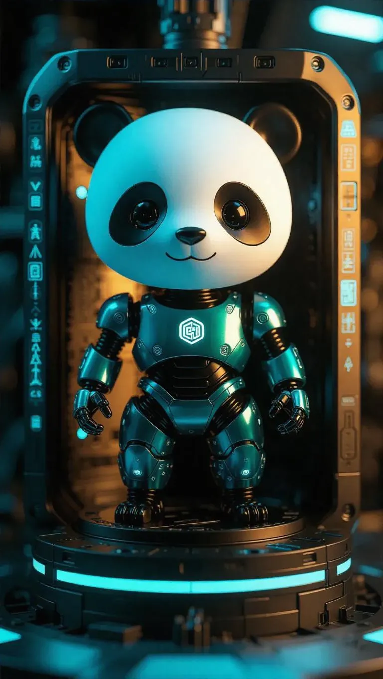 A toy robot panda with matte teal and shiny bronze panels stands on a rotating platform inside its packaging. The box pulses with kinetic energy effects, featuring gradient logos and a QR code that unlocks crafting themes. Set in a modern-themed toy assembly facility, the scene is illuminated by dynamic, soft lights casting relaxing shadows, emphasizing the soothing and contemporary setting. The style is tranquil and calming, blending realism with zen aesthetics.
