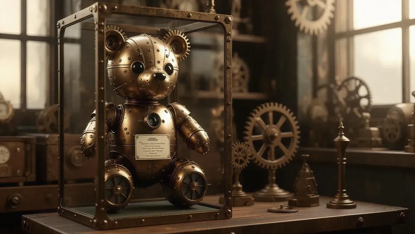 A steampunk teddy bear toy crafted from mixed metals, silk threads, and lens covers, featuring a winding key on its back. It stands in a display case with eclectic textures, a faux-leather label, and a heavy glass window frame. The scene is set inside a vintage toy workshop, surrounded by intricate blueprints and gears. Soft, pastel light filters through the windows, casting gentle shadows and showcasing the delicate details of the bear and the workshop. The style is realistic, emphasizing the tactile and mechanical elements.