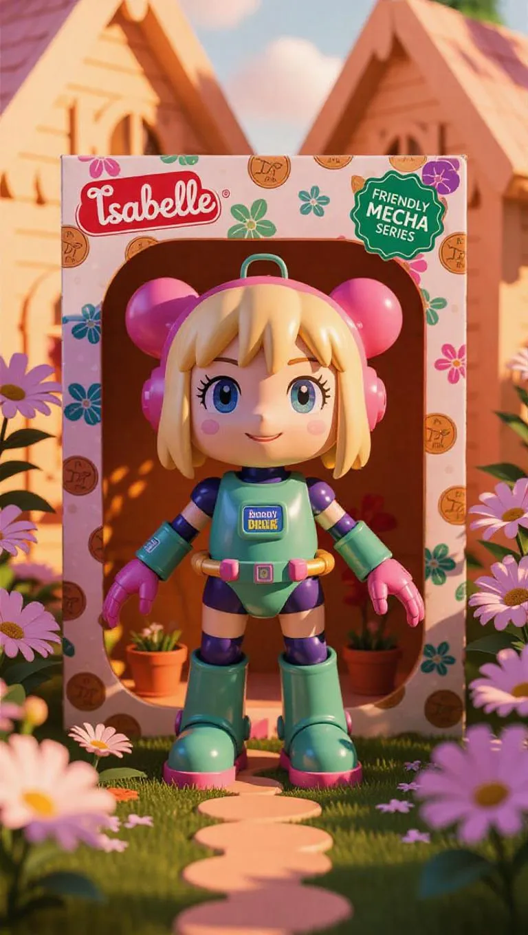 A steam-powered, anime-inspired toy figure of Isabelle as a plumber-bot, featuring friendly pastel pipes, jet boots, and gardening arms. The premium packaging showcases nature-themed coin textures, campsite overlays, and a “Friendly Mecha Series” sticker. Set against a cozy toy village with blooming flowers, the scene is bathed in warm, welcoming light with soft shadows, enhancing the retro-futuristic aesthetic.