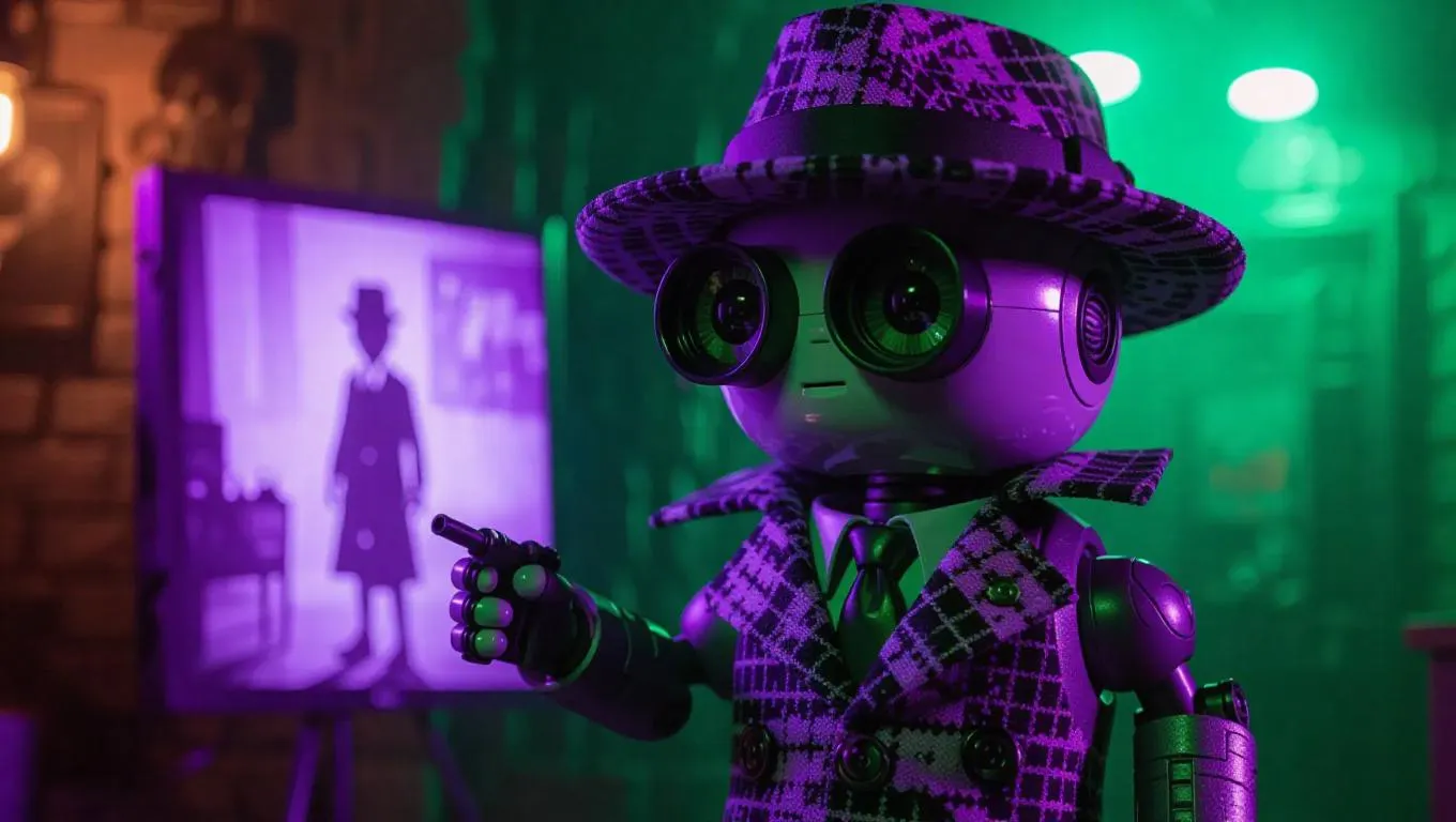 A toy detective droid with a camera lens eye that captures details, a trench-coat made of patchwork fabric, and a fedora adorned with a tiny telescope. Matte-purple body with white accents, stylized gothic detective features. Interactive crime-scene display with electronic clues and audio recordings, animated shadow of a suspicious figure. Cool green-toned lighting, mysterious atmosphere, surreal style.