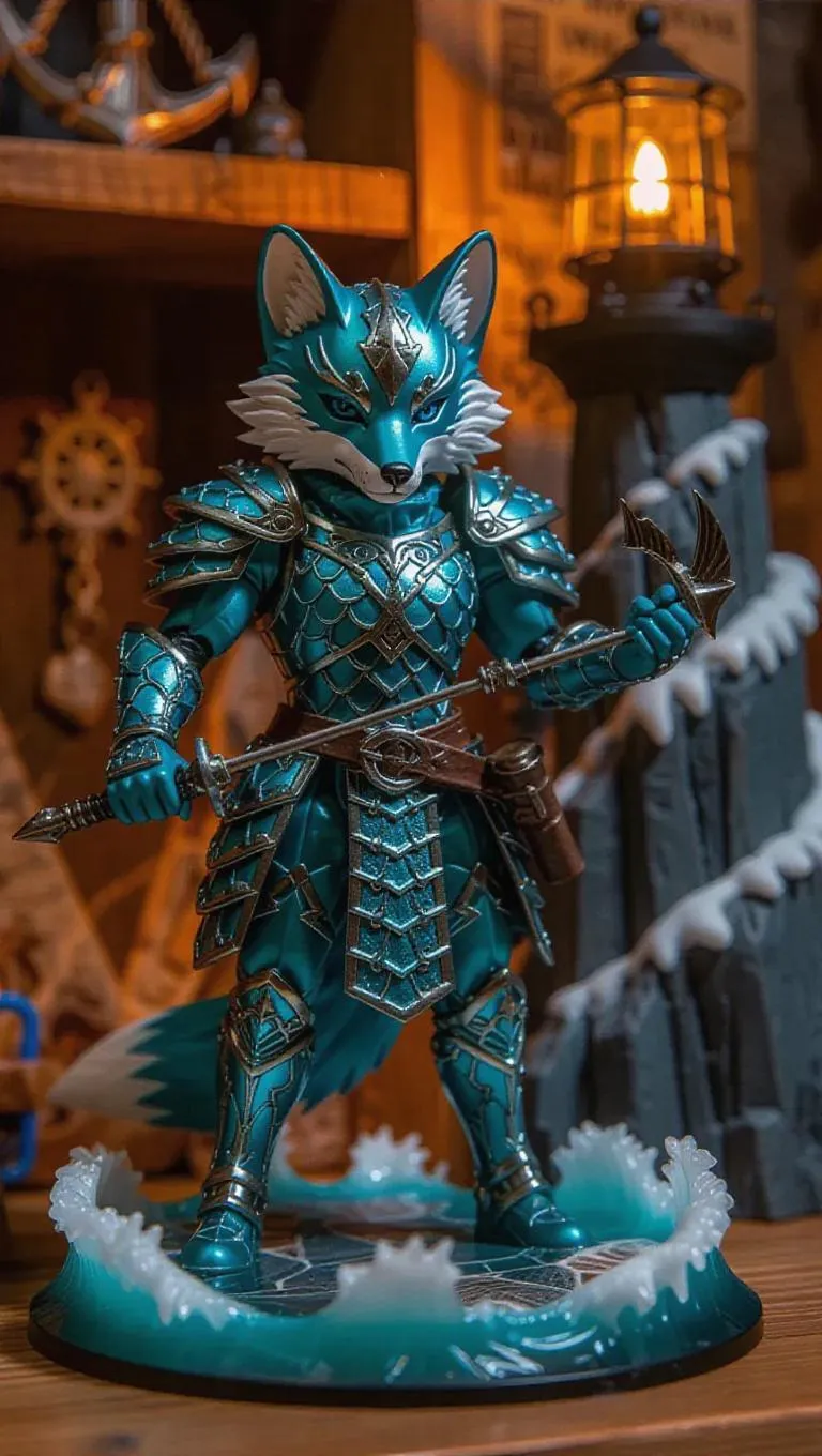 A sleek fox warrior toy clad in turquoise and silver armor with intricate ocean wave patterns, wielding a harpoon. The box showcases a coastal scene with cliffs and nautical symbols, including a seaside pouch for accessories. Set in a lighthouse workshop with sailor tools and charts, illuminated by a guiding beacon, enhancing the toy's nautical design. Style: Realistic.