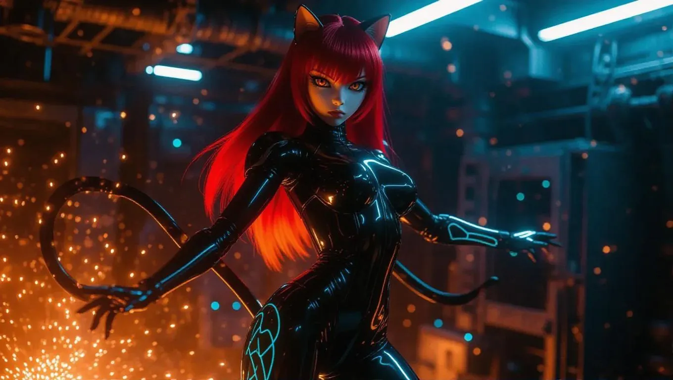 A futuristic catgirl action figure, with a flexible tail whip and an iridescent bodysuit, features glowing cyan tattoos on her thighs. Her long fiery red hair and fierce orange eyes add to her striking appearance. The packaging glows with glimmering white neon patterns and has flip-top closure panels. Set against a chaotic toy factory backdrop, with sparks, flying drones, and energy lasers embedded in the walls. Lighting is dynamic and dramatic, casting high-contrast shadows and brightness. Style: Sci-Fi, Cyberpunk.