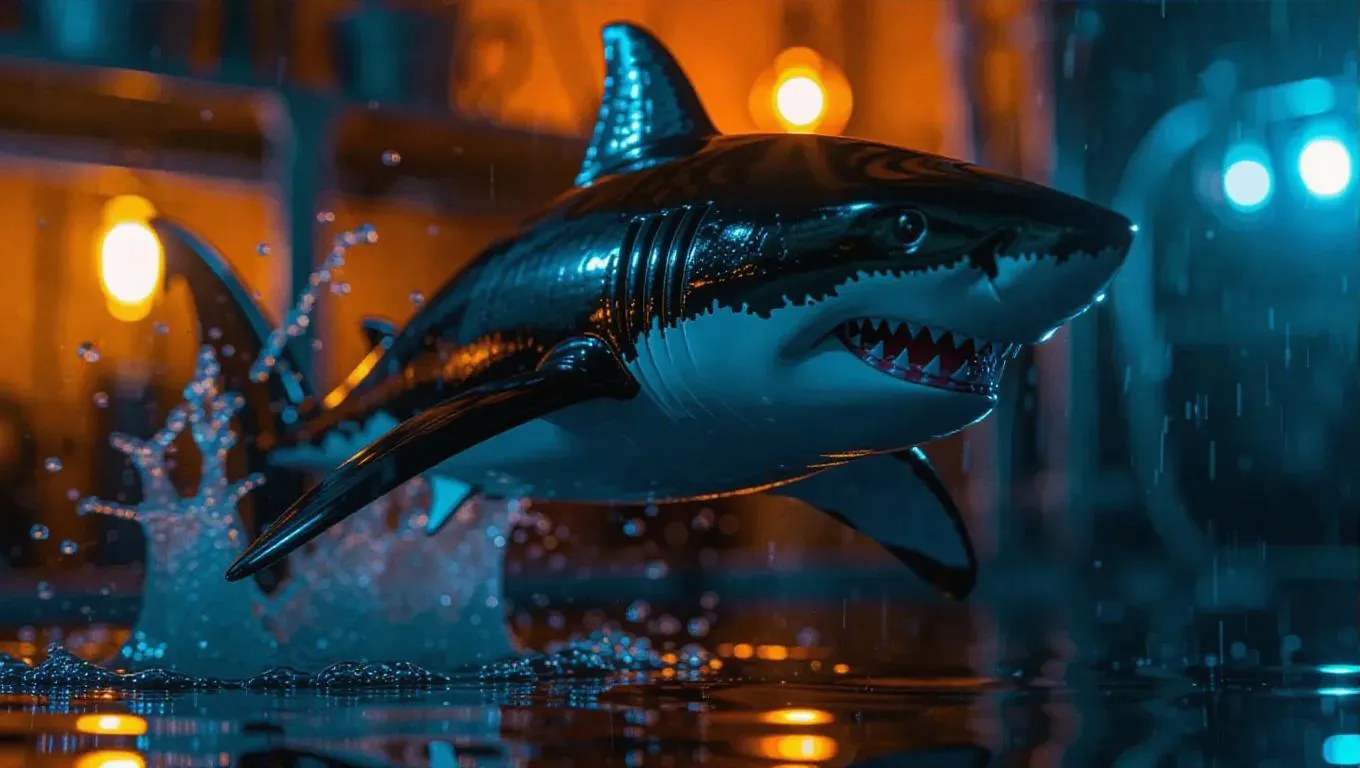 A 1:6 scale superhero shark figure in a dynamic underwater pose, wearing a glowing black nano-suit with glowing gills and a plasma harpoon. Premium box inserts feature water splash effects and comic-style bubbles. Set against a high-energy toy prototyping chamber, illuminated with teal and grey lights, hyper-realistic with a touch of comic book flair.
