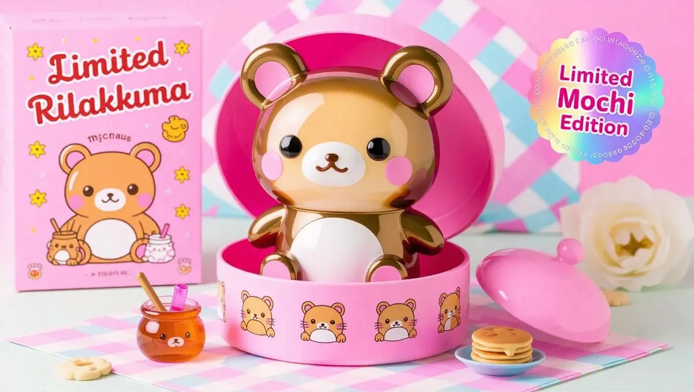 A mochi-inspired collectible action figure of Rilakkuma, packaged inside a soft, pastel toy box. Rilakkuma has a squishy, mochi-like design with a glossy finish and a round, chubby body. Oversized, adorable ears, large, sparkling eyes. Packaging features sweet, pastel fonts, mochi illustrations of Rilakkuma in cute poses, holographic 'Limited Mochi Edition' sticker. Includes accessory parts like a mini honey pot and tiny pancake. Cozy, pastel-themed picnic background. Style: mochi, kawaii, high detail, collectible figure, soft lighting, pastel colors.