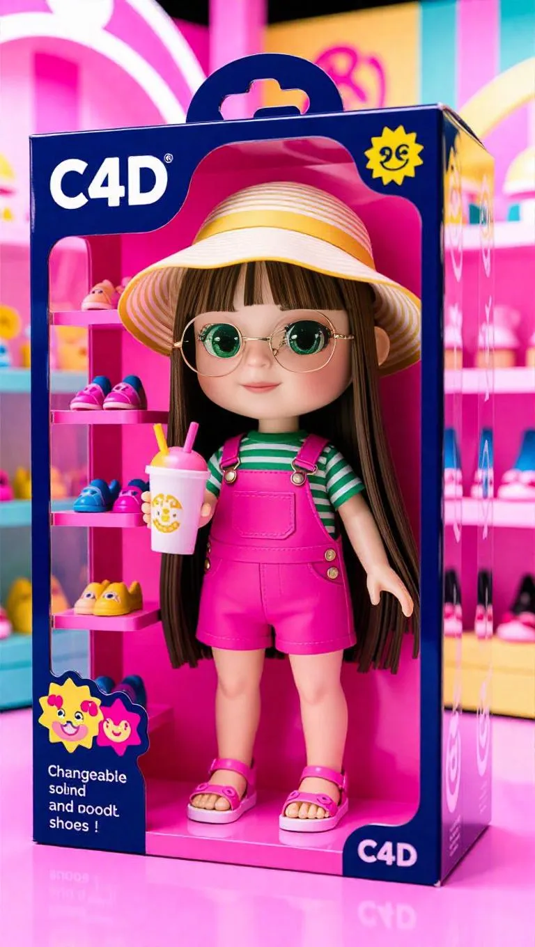 C4D, a dark blue paper toy box is completely wrapped in transparent plastic film. The box body has a large observation window to show the inside. A 3D cartoon-style girl doll is wearing pink overalls with a green and white striped shirt, light brown straight long hair with side bangs, a round face with big green eyes and thin eyebrows, a yellow and white sunhat and round glasses, holding a fruit smoothie cup, and wearing flat sandals. The package contains two changeable sun hats and three pairs of shoes of different styles. The background features a vibrant toy store display stand in pastel tones. The plastic packaging film reflects the ambient light, presenting a shiny texture. The overall picture is full of the charm of a collectible figurine.