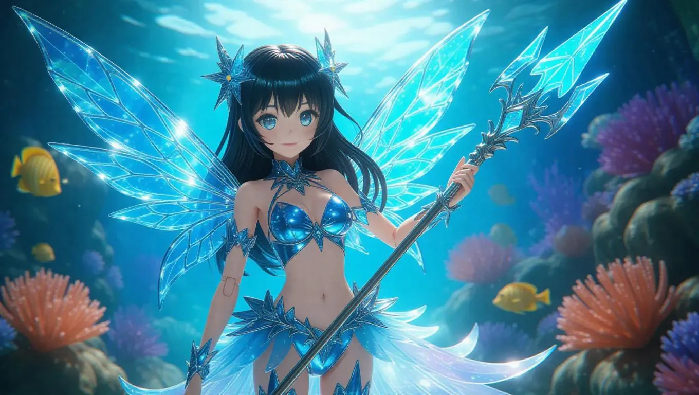 A magical girl action figure with iridescent, water-like wings, holding a spear that glows with vibrant aqua energy. Her eyes sparkle like the brightest sapphires, and her outfit is adorned with delicate sea patterns and starfish. The toy box features a beautiful ocean wave design, set against a serene underwater grotto filled with colorful fish and coral reefs. Style: Realistic with an aquatic fantasy twist.