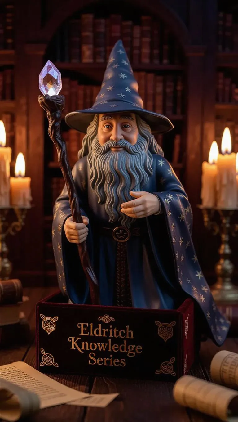 A collectible figure of a wise old wizard, thoughtfully sitting in a library. His flowing gray robe, covered in intricate star patterns, drapes elegantly, and his staff is topped with a glowing crystal. A knowing smile graces his face, and his gentle, kind eyes twinkle with timeless wisdom. The toy box features an aged brown velvet exterior, gold owl motifs, and "Eldritch Knowledge Series" branding. The background is a cozy study with towering bookshelves, flickering candles, and scrolls scattered around. Warm, golden candlelight creates a welcoming glow, enhancing the intricate details of his robes and the richness of the environment. Mystical fantasy meets literary whimsy, emphasizing charming details and a warm, inviting atmosphere.