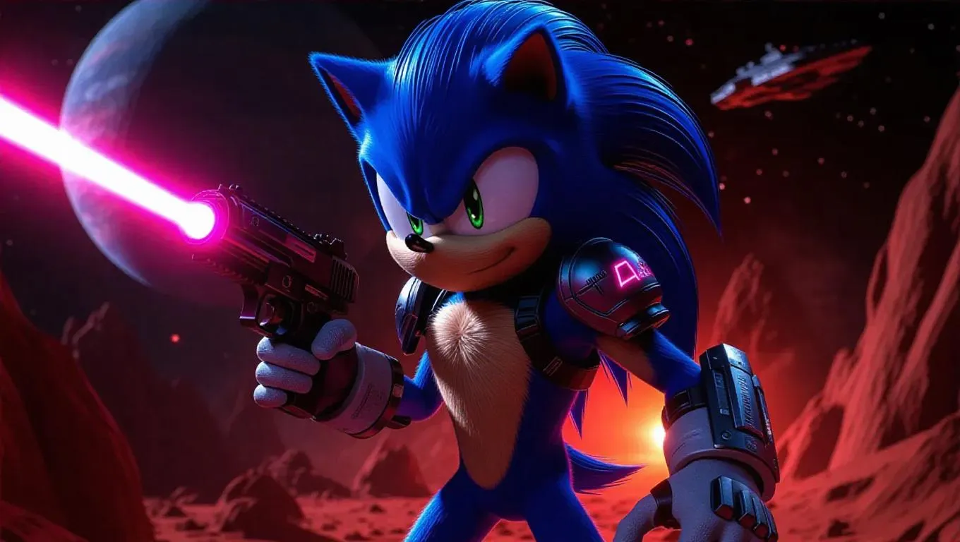 Sonic the Hedgehog, reimagined as a sci-fi bounty hunter, wears high-tech shoulder pads, a plasma gun tail-blade, and a visor. Dynamic anime-style motion lines and alien glyphs adorn the box art. The scene is set on a desolate planet with distant spacecraft and rocky terrain. Stark, harsh light highlights the tech gear and contrasts with the dark, void-like ambient lighting. The style infuses realistic and anime aesthetics, showcasing the fusion of space noir and action.