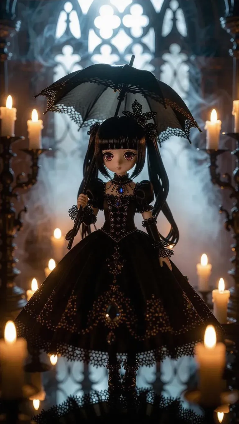A gothic lolita action figure, dark and whimsical, dressed in a lavish dress adorned with intricate gemstone and crystal motifs. Wields a parasol that transforms into a magical mirror. Toy box showcases a hauntingly beautiful palace surrounded by swirling fog. Background: A shadowy hall with flickering candles casting enchanting shadows.