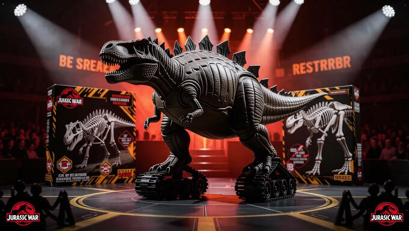 A mechanized Ankylosaurus figure with stabilizing tracks and a battering tail stands steadfast in a dino-themed battle arena. The figure's packaging includes fierce dinosaur skeleton overlays, combat warnings, and "Jurassic War Series" branding. Arena props and audience stands crowd the background, highlighted by intense, focused spotlighting. The atmosphere radiates a sense of competition and power, showcasing the fierce design of the figure and the excitement of the arena.