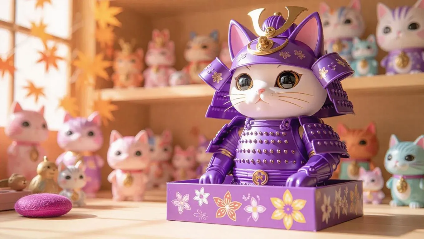 A samurai cat warrior toy clad in lacquered lavender armor adorned with butterfly patterns and triple blade tails. The box features autumn foliage, Japanese origami stamps, and a felt pouch. Set against an artistic studio with colorful toy shelves, the scene is illuminated by soft, dappled light, casting gentle shadows that enhance the toy's detailed craftsmanship. Style: Realistic.