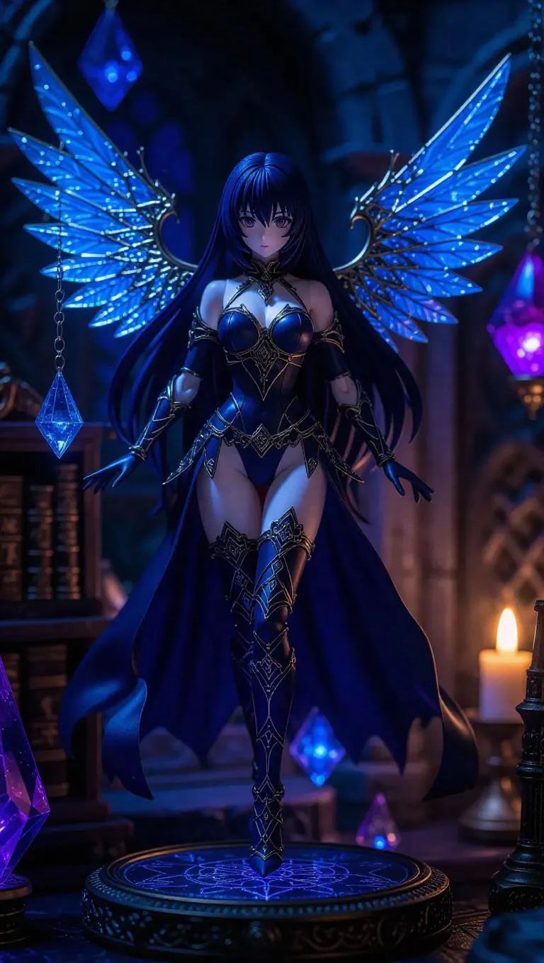An anime sorceress action figure with shimmering wings and enchanted wraps flows off her slender body. Midnight blue hair cascades down her back, and her magical skin glows under mystical, cool front lighting. The toy box features arcane motifs, gold accents, and a crystal-clear window shaped like runes. In a wizard's tower scene, spellbinding toy parts float midair under mystic, soft side lighting. Style: Arcane Fantasy, Magical.
