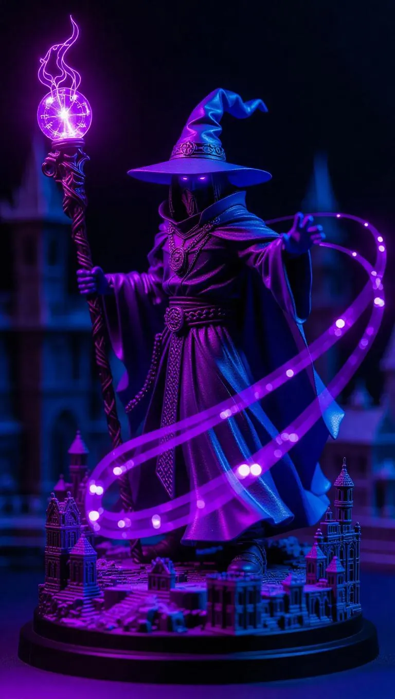 Hyper-detailed toy action figure of a cyberpunk wizard, fusing an ancient staff with neon-lit circuitry. Translucent energy waves swirl around the figure, crafted from iridescent resin that shifts colors under varying light. The base showcases a floating, broken clockwork cityscape, capturing the wizard in a dynamic mid-spell-casting pose.