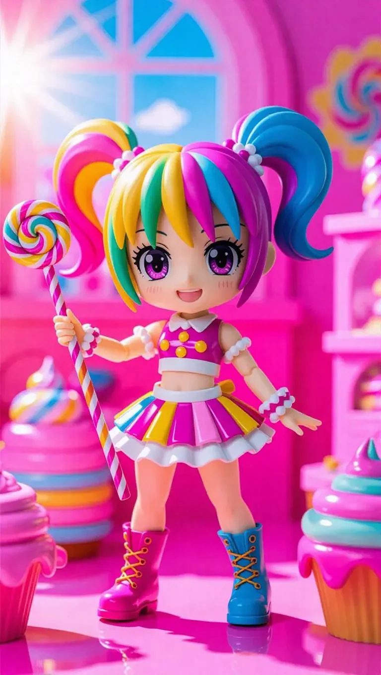 A candy-colored anime girl action figure, dressed as a magical sweetness engineer, sports frosting-themed hair, a jelly bean staff, and citrus boots. The toy box showcases smooth curls and shiny colorful candy patterns, along with bonus mini-figures. The background depicts a candy factory creating sweets-themed toys, bathed in bright, sunny light with a touch of shiny highlights. Style: Chibi anime with a bright, lively aesthetic.