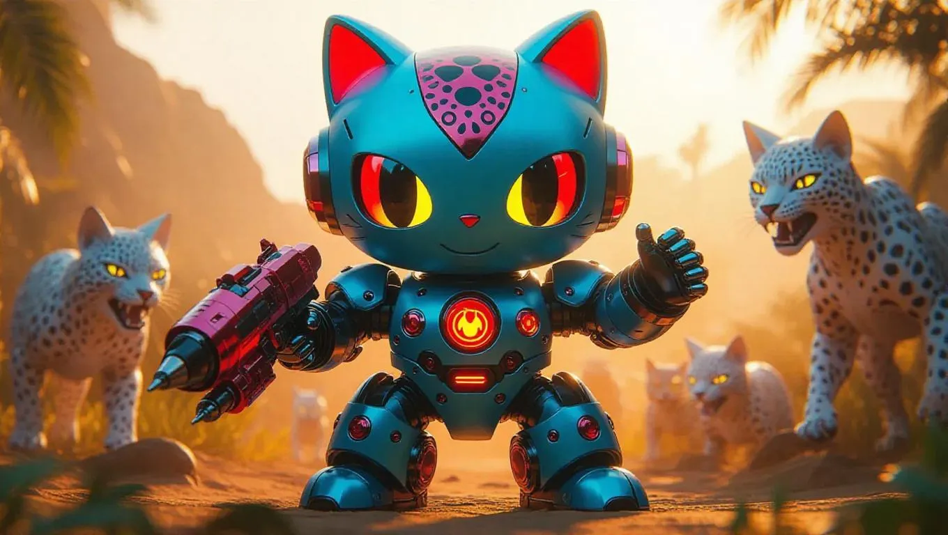 A brilliant cyan and crimson robotic Hello Kitty mech figure with cheetah ears and a rocket-launching bow stands prominently. The figure's packaging is highlighted with animal print-themed designs and flame-shaped holographic labels, including additional bonus gear. The background features a wild toy safari, filled with roaming mechanical animals and an exciting, adventurous atmosphere. Bold, contrastive light casts fierce highlights on the figure, enhancing its dynamic appearance. The style combines energetic and wildlife-inspired elements, echoing untamed nature.