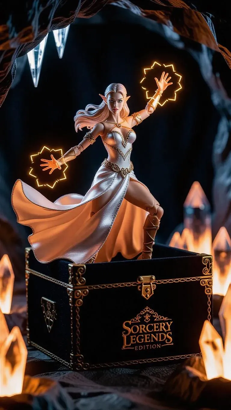 A collectible figure of a daring elf sorceress, posed in an action stance with her silk gown elegantly draped, showcasing fierce magical energy patterns. The toy box features rich gold velvet textures, black runic accents, and "Sorcery Legends Edition" branding. The background is a dark cavern illuminated by glowing crystals and ethereal flames. Sharp, dramatic light creates intense highlights on the figure, amplifying her powerful presence. The style combines classic fantasy elements with contemporary design, featuring dynamic lines and a thrilling atmosphere.