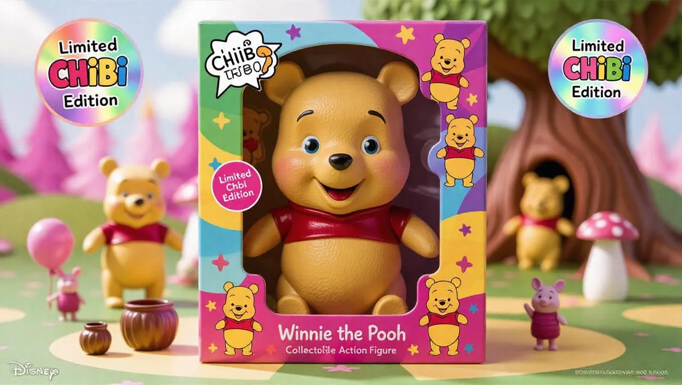 A chibi-style collectible action figure of Winnie the Pooh, packaged inside a vibrant, colorful toy box. Winnie the Pooh has a super-deformed design with an oversized head, tiny body, and a glossy finish. His iconic round shape is exaggerated for maximum cuteness, with large, sparkling eyes. The packaging features playful, cartoonish fonts, chibi illustrations of Winnie the Pooh in adorable poses, and a holographic 'Limited Chibi Edition' sticker. The box includes accessory parts like a mini honey pot and a tiny balloon. Background showcases a cheerful, pastel-themed Hundred Acre Wood. Style: chibi, kawaii, high detail, collectible figure with soft lighting and vibrant colors.