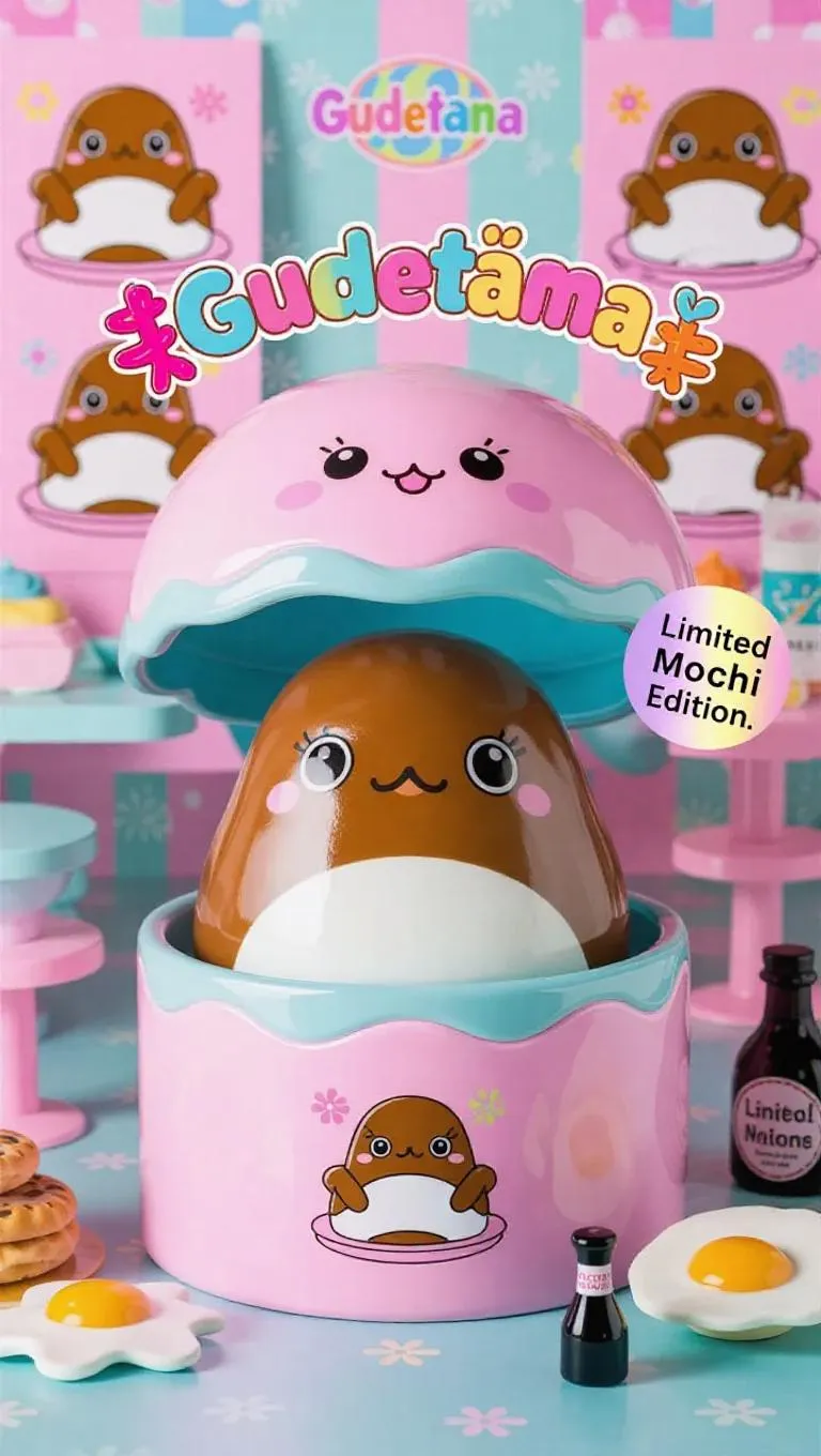 A mochi-inspired collectible action figure of Gudetama, packaged inside a soft, pastel toy box. Gudetama has a squishy, mochi-like design with a glossy finish and a round, chubby body. Oversized, adorable yolk shell, large, sparkling eyes. Packaging features sweet, pastel fonts, mochi illustrations of Gudetama in cute poses, holographic 'Limited Mochi Edition' sticker. Includes accessory parts like a mini fried egg and tiny soy sauce bottle. Cozy, pastel-themed diner background. Style: mochi, kawaii, high detail, collectible figure, soft lighting, pastel colors.