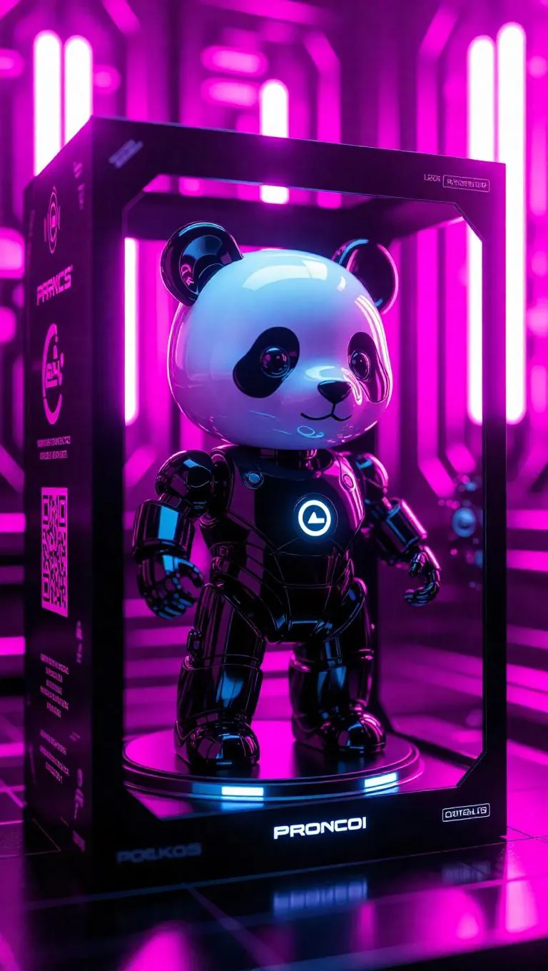 A toy robot panda with deep black and bright silver panels stands on a rotating platform inside its packaging. The box pulses with kinetic energy effects, featuring digital logos and a QR code that unlocks online challenges. Set in a high-energy toy assembly facility, the scene is illuminated by stark, purple lights casting figure-like shadows, emphasizing the dramatic and digital setting. The style is modern and sleek, blending realism with cyber aesthetics.