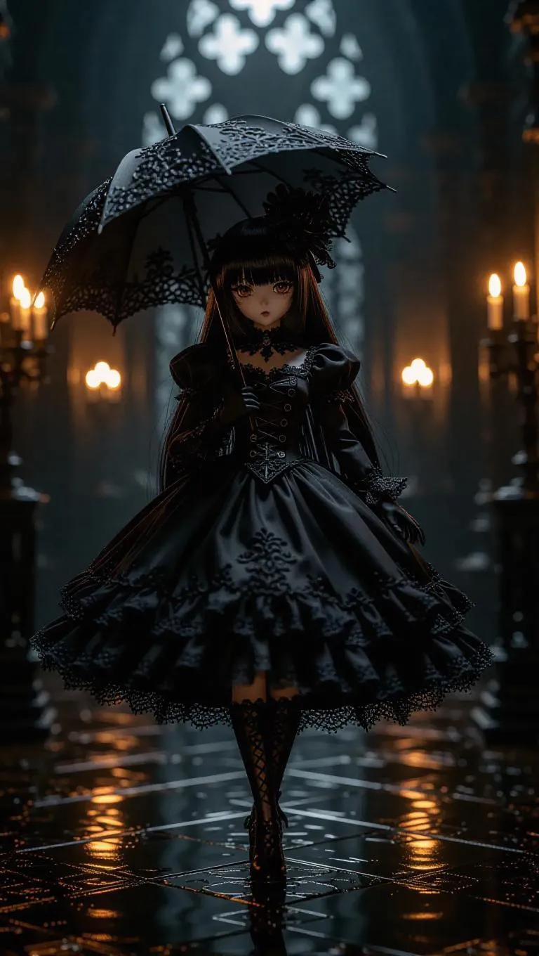 A gothic lolita action figure, dark and sophisticated, dressed in a lavish dress adorned with intricate raven and thistle motifs. Wields a parasol that transforms into a stealthy blade. Toy box showcases a hauntingly beautiful manor surrounded by thick mist. Background: A shadowy corridor with flickering candles casting suspenseful shadows.