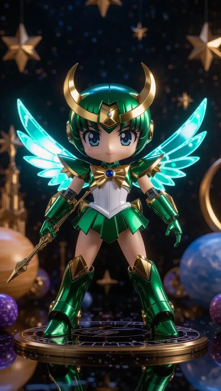 A high-gloss green and gold robotic Sailor Jupiter mech figure with crescent moon wings and a lightning-launching wand stands prominently. The packaging is adorned with star-themed designs and crescent moon-shaped holographic labels, featuring bonus gear arms. The background showcases a magical toy factory filled with floating mechanical planets and a whimsical, celestial atmosphere. Soft, warm light casts gentle highlights, enhancing the figure’s glossy finish. Style: Cute and futuristic with a touch of cyberpunk flair.