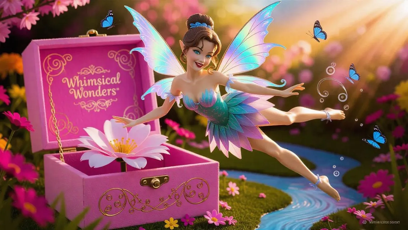 A collectible figure of a seductive fairy, playfully hovering above a blooming flower. Her radiant, iridescent wings shimmer with every movement, and her flowing dress is crafted from delicate petals. A mischievous smile dances on her lips, and her teal eyes sparkle with an enchanting light. The toy box features a pastel pink velvet exterior, golden swirl designs, and "Whimsical Wonders Series" branding. The background is a vibrant garden with colorful blossoms, fluttering butterflies, and trickling streams. Soft, warm sunlight highlights the vivid colors and details of her costume, creating a delightful and enchanting scene. Magical realism meets floral fantasy, emphasizing whimsical details and a joyful, playful atmosphere.