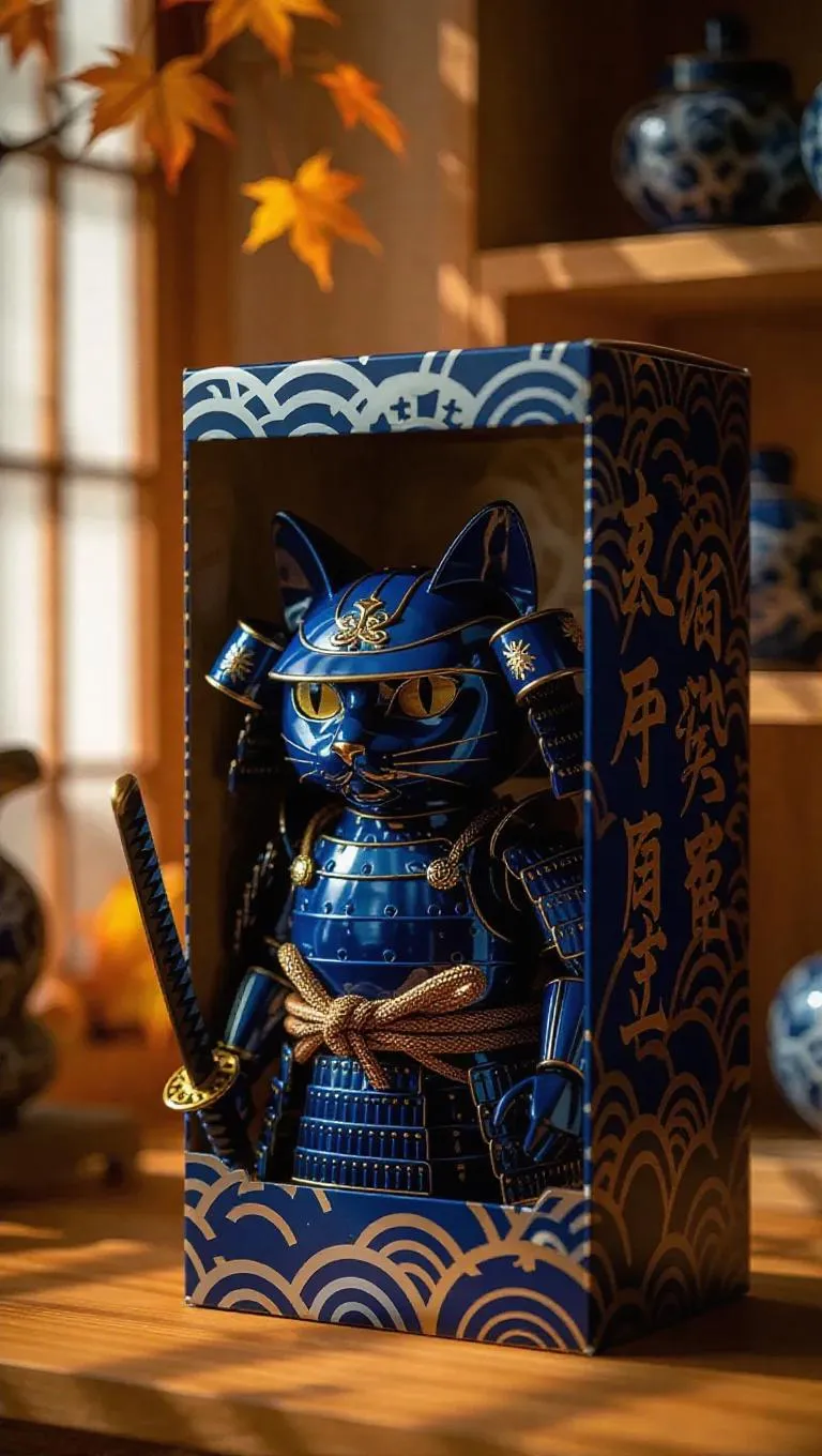 A samurai cat warrior toy clad in lacquered blue armor adorned with intricate wave patterns and single blade tail. The box features autumn leaves, Japanese character stamps, and a silk pouch. Set against a minimalist workshop with wooden toy shelves, the scene is illuminated by bright, cool light, casting sharp shadows that enhance the toy's detailed craftsmanship. Style: Realistic.