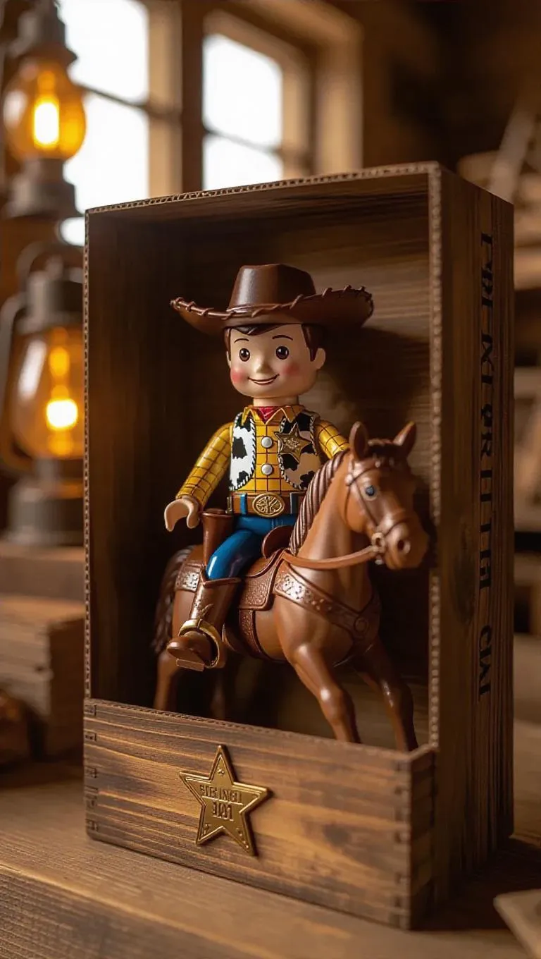 A weathered toy cowboy with bronze accents perches on a rocking horse platform inside his rustic, wood-grain packaging. The box features a removable sheriff badge sticker. In a dimly lit Wild West-themed toy factory, yellow-orange oil lamps cast flickering shadows on wooden beams, enhancing the rugged, adventurous atmosphere. Realistic Western aesthetics.
