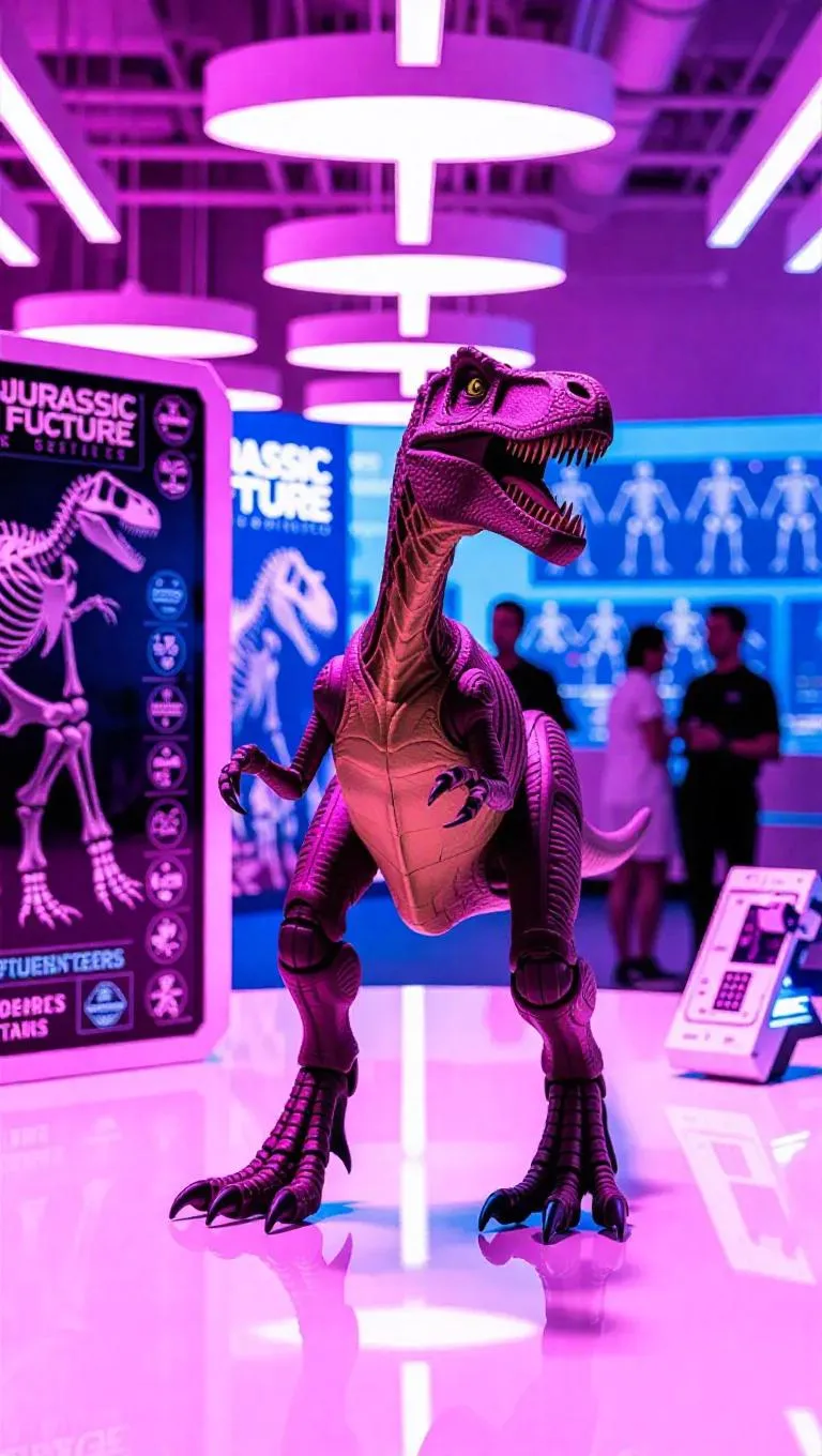 A robotic Therizinosaurus model with clawed blades and a holographic display stands strikingly in a dino-themed tech expo. The figure's packaging is adorned with dynamic dinosaur skeleton overlays, tech alerts, and "Jurassic Future Series" branding. High-tech gadgets and prototypes fill the background, enhanced by bright, innovative expo lighting. The ambiance combines the allure of futuristic tech with natural history, drawing attention to the figure and the tech-savvy environment.